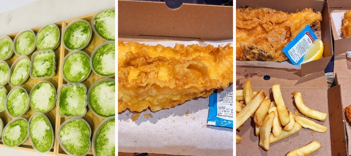 The menu features a variety of options including classic cod and haddock, savory sausages, chicken burgers, and even vegetarian pies.